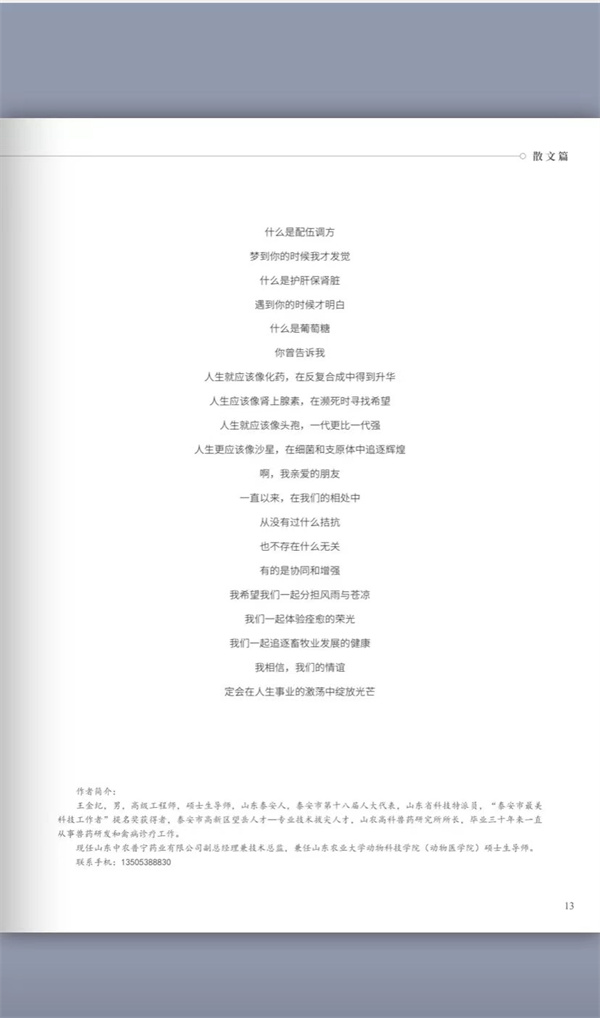 為了更好的弘揚(yáng)獸醫(yī)文化,展現(xiàn)獸醫(yī)風(fēng)采,提升獸醫(yī)價(jià)值,由中國獸醫(yī)協(xié)會(huì)獸醫(yī)文化分會(huì)主辦的《獸醫(yī)之魂》文創(chuàng)作品集第一期如約而至,公司技術(shù)總監(jiān)王金紀(jì)的散文《獸藥情》,被收錄于本期散文章節(jié)的第一篇,特在此分享出來,與大家共同欣賞。