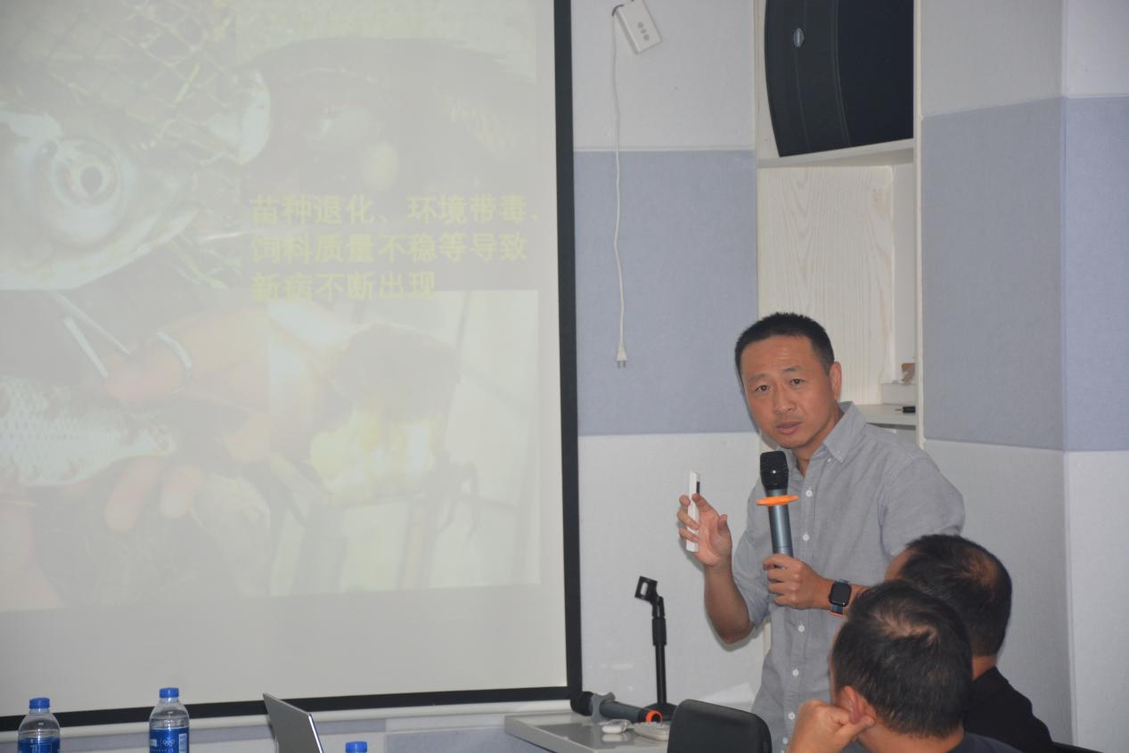 在銷售團(tuán)隊(duì)作完工作匯報(bào)后,公司技術(shù)顧問袁圣老師為參會(huì)人員作了精彩的技術(shù)報(bào)告。袁老師從全國水產(chǎn)養(yǎng)殖普遍存在的問題入手,不斷細(xì)化,用科學(xué)的數(shù)據(jù)和大量的現(xiàn)場診斷實(shí)例,為大家講解了養(yǎng)殖中存在的問題和常見疾病的診療方法。